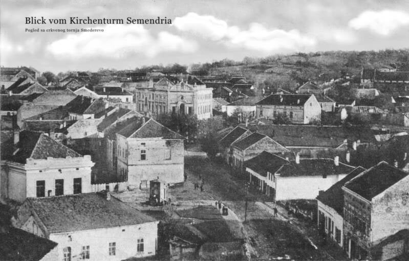 Црква, Начелство и Тврђава. Такође се примећује и дим локомотиве која улази у станицу. На цркви се види сат са црним бројчаником који је трајао све до Првог светског рата, при чему је био оштећен. Приликом обнове замењен је белим бријчаником који траје све до данас